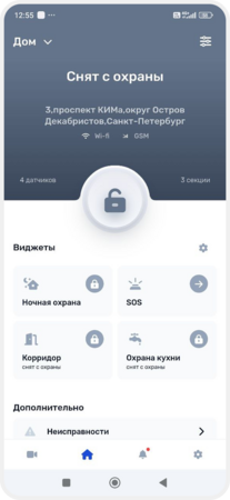 Виджеты «Ночная охрана» и «SOS» добавляются автоматически и всегда отображаются первыми. Они закреплены по умолчанию и не требуют дополнительной настройки.