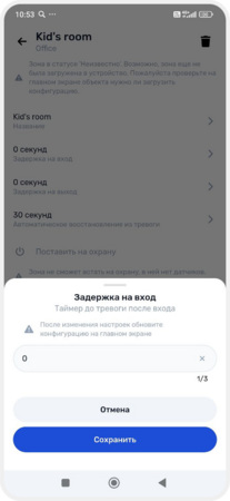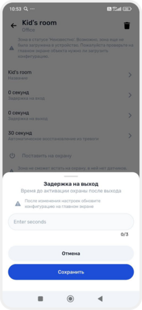 — задать задержку на вход — время до срабатывания тревоги