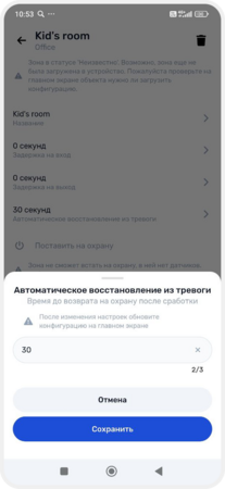 — включить автоматическое восстановление — возврат зоны в охрану после тревоги