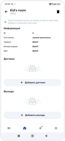 Чтобы зона могла работать, добавьте в неё датчики и выходы: